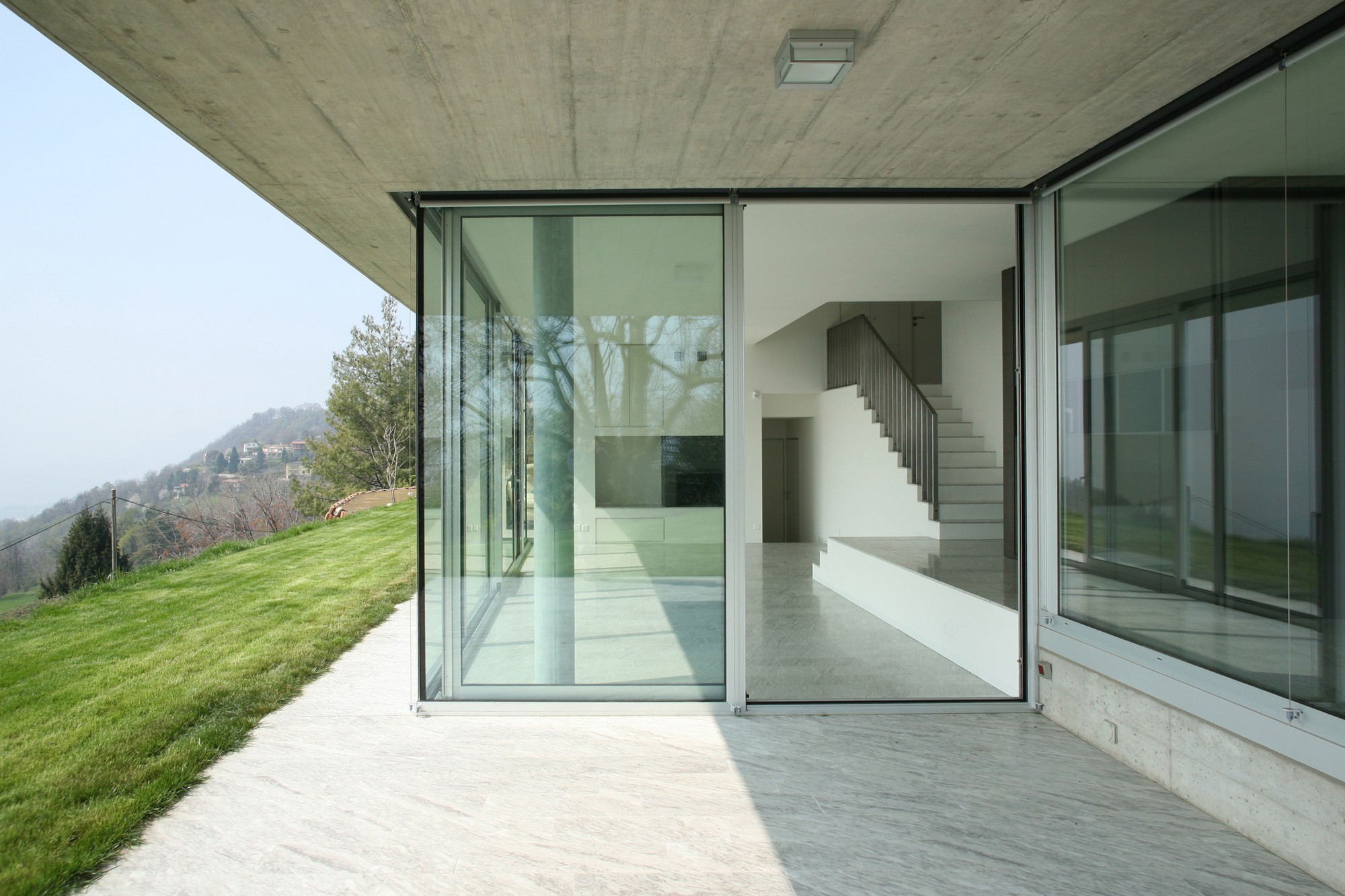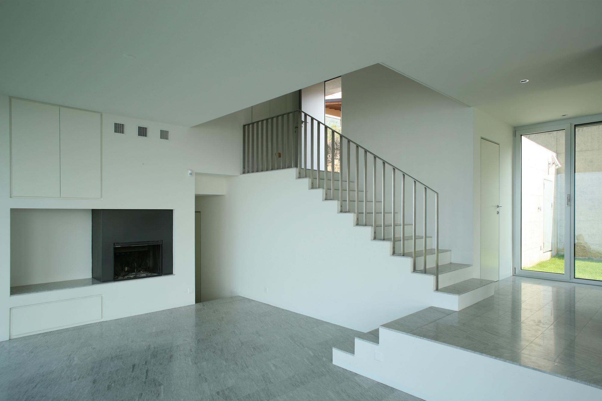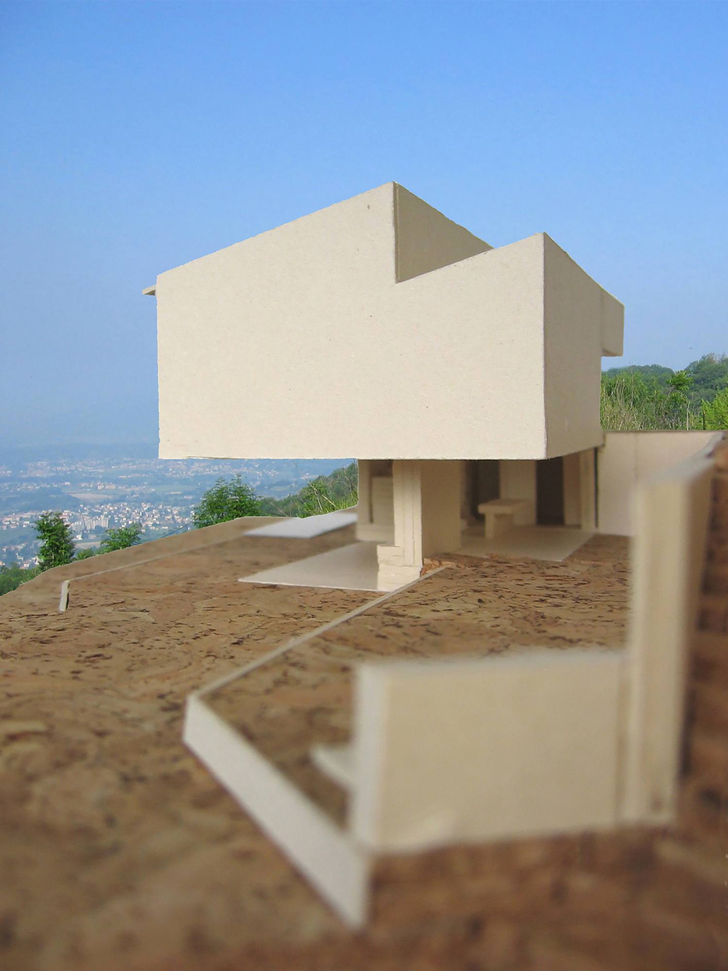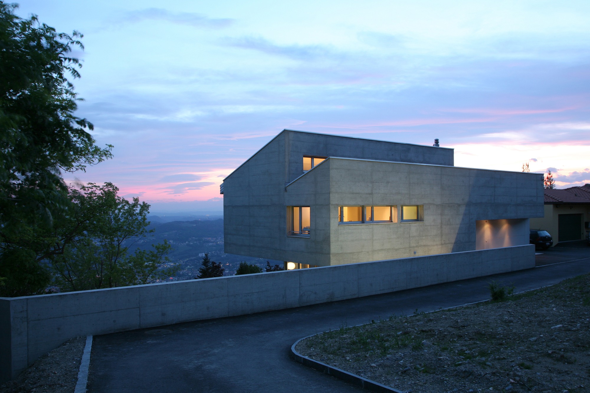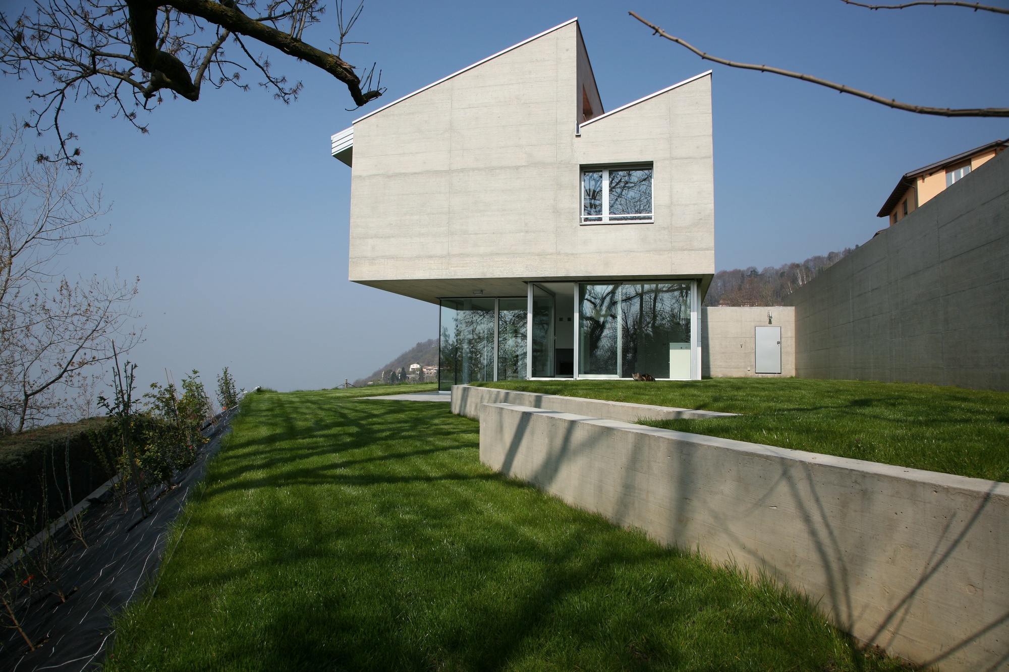 La casa monofamiliare, progettata per una giovane coppia, permette di vivere appieno la posizione geografica spettacolare del terreno. La vista, che spazia da Como e la pianura Padana fino al Mendrisiotto e le Alpi, viene inquadrata da un soggiorno ampiamente vetrato su tre lati ed in diretto contatto con il giardino circostante. Il livello superiore, con le camere, si contrappone come corpo massiccio e più chiuso. Il tetto, con due falde rivolte entrambe a valle, apre lo spazio interno della casa verso la montagna e la luce del mattino. L'espressione del volume si relaziona con quella degli edifici industriali presenti nel fondovalle. Sia all'esterno che all'interno i cambiamenti di livello sono ben percepibili e creano un continuum spaziale che rimanda ai terrazzamenti artificiali del terreno, elementi caratteristici del costruito alpino.