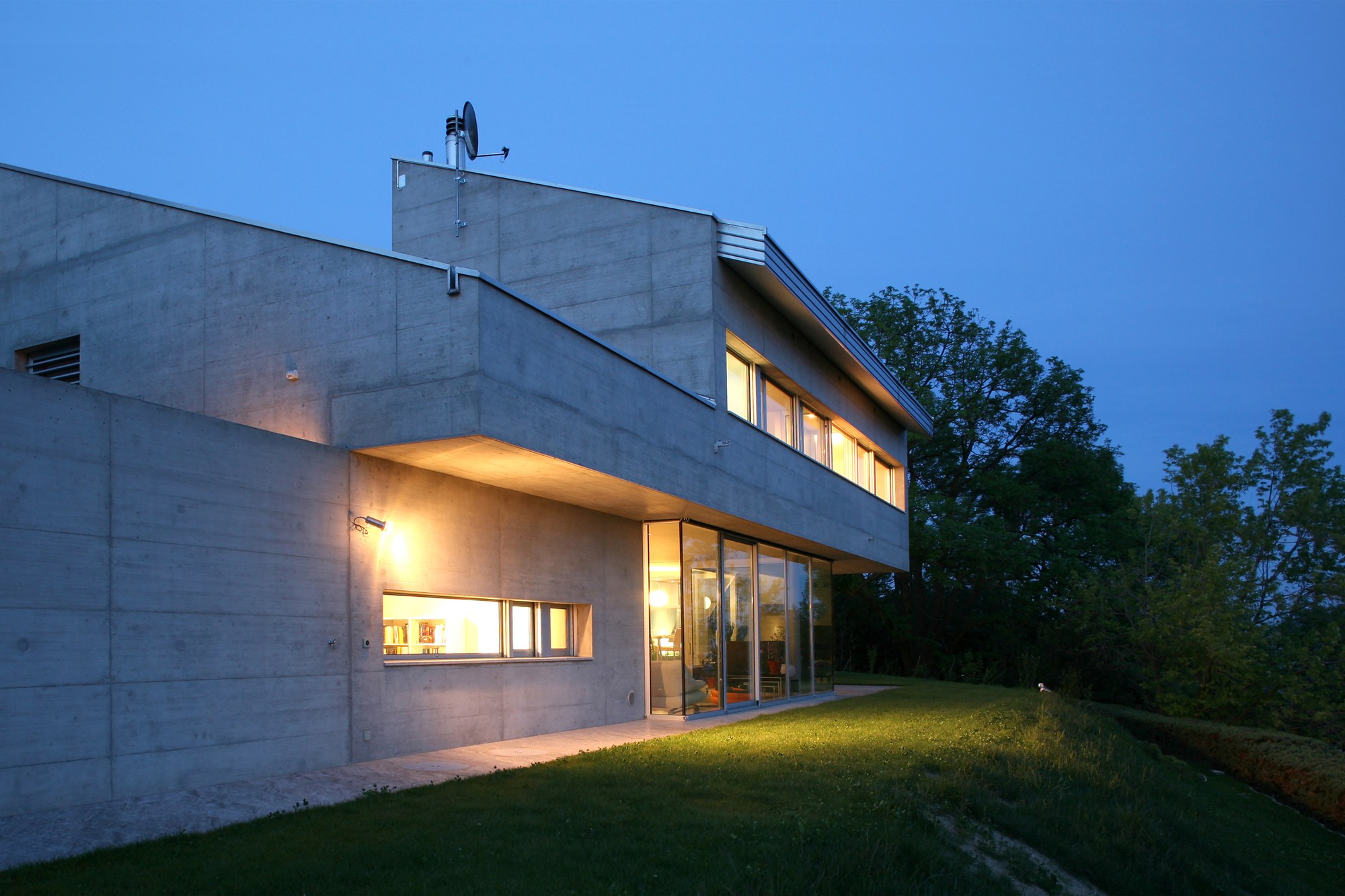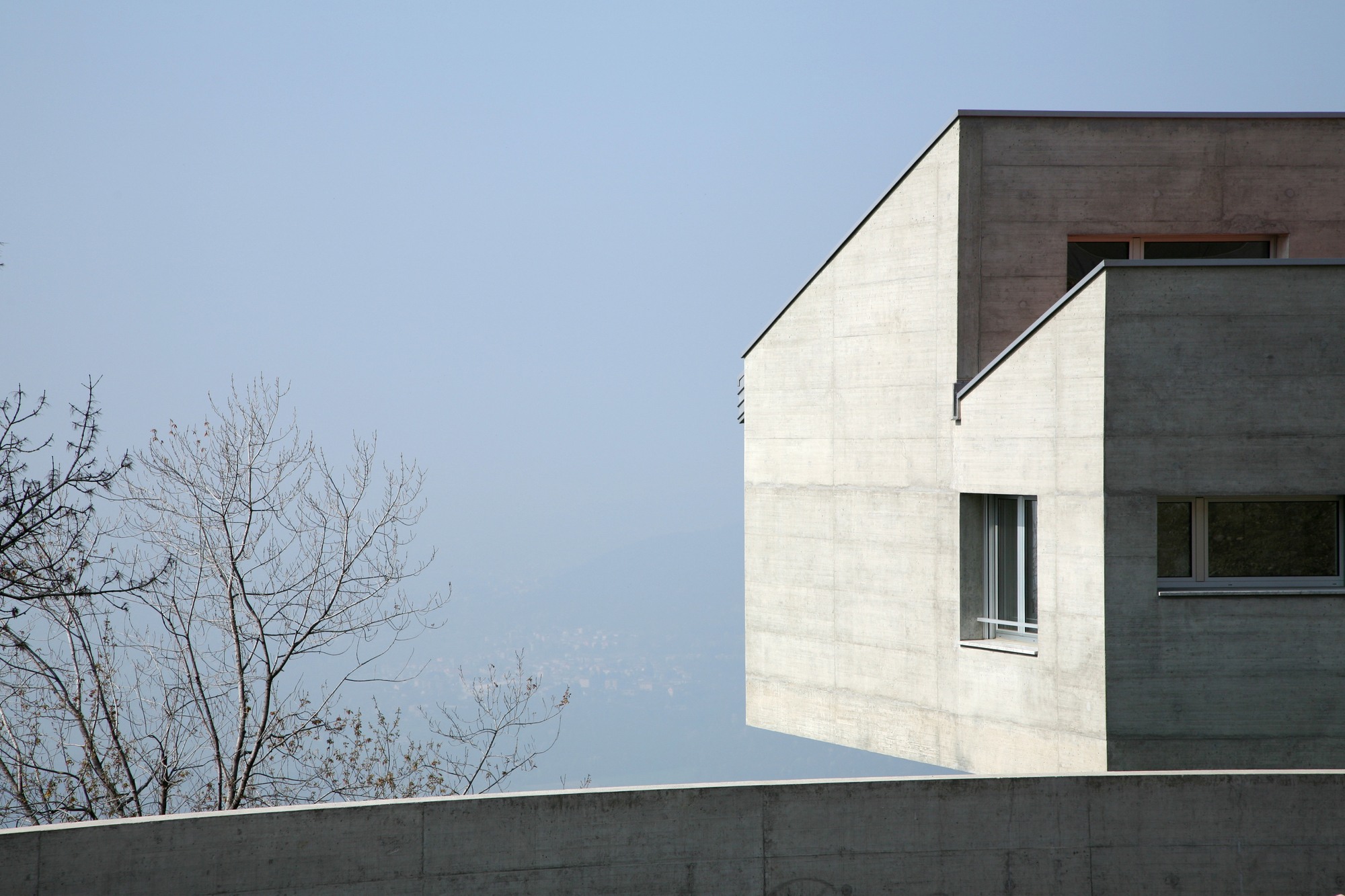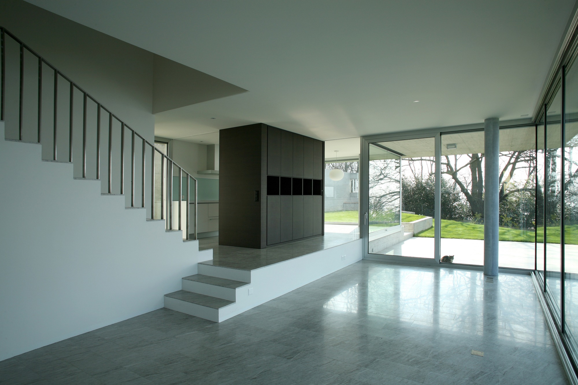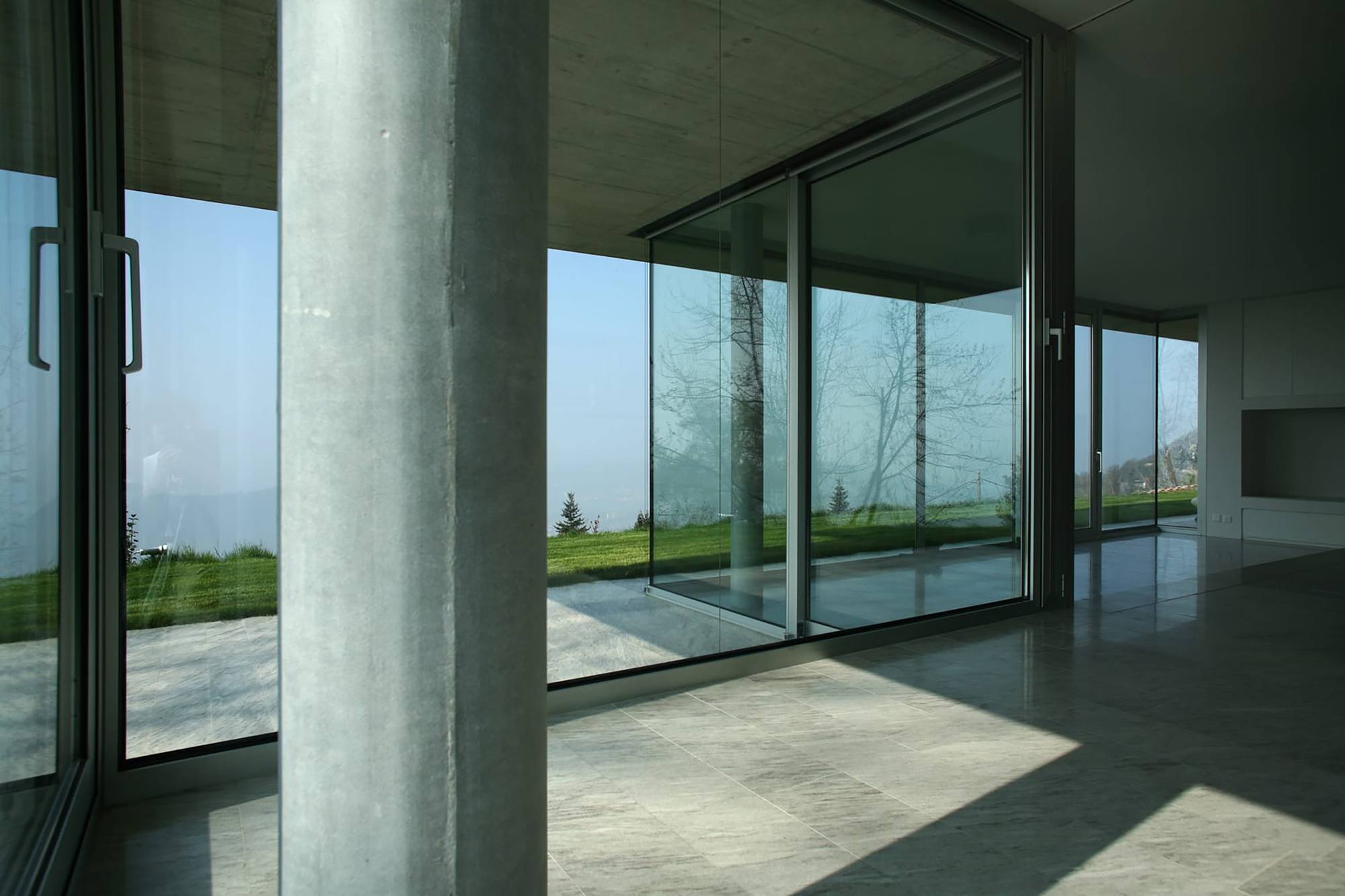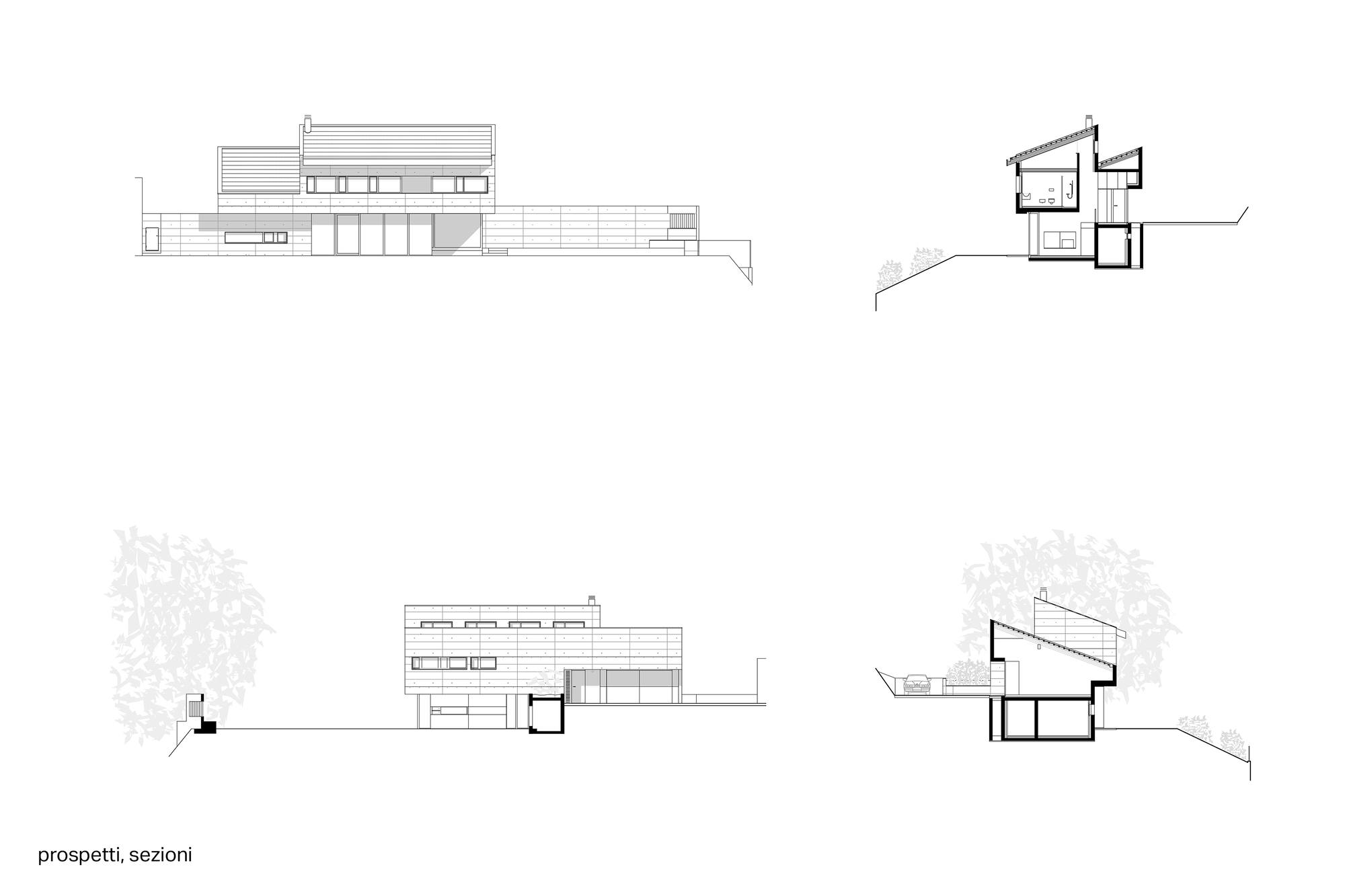 La casa monofamiliare, progettata per una giovane coppia, permette di vivere appieno la posizione geografica spettacolare del terreno. La vista, che spazia da Como e la pianura Padana fino al Mendrisiotto e le Alpi, viene inquadrata da un soggiorno ampiamente vetrato su tre lati ed in diretto contatto con il giardino circostante. Il livello superiore, con le camere, si contrappone come corpo massiccio e più chiuso. Il tetto, con due falde rivolte entrambe a valle, apre lo spazio interno della casa verso la montagna e la luce del mattino. L'espressione del volume si relaziona con quella degli edifici industriali presenti nel fondovalle. Sia all'esterno che all'interno i cambiamenti di livello sono ben percepibili e creano un continuum spaziale che rimanda ai terrazzamenti artificiali del terreno, elementi caratteristici del costruito alpino.